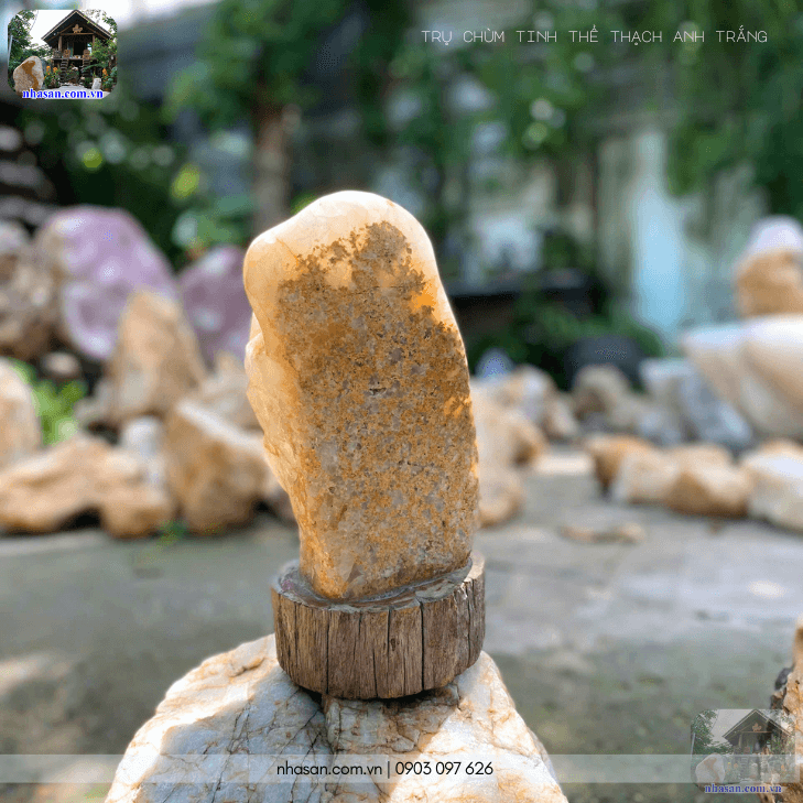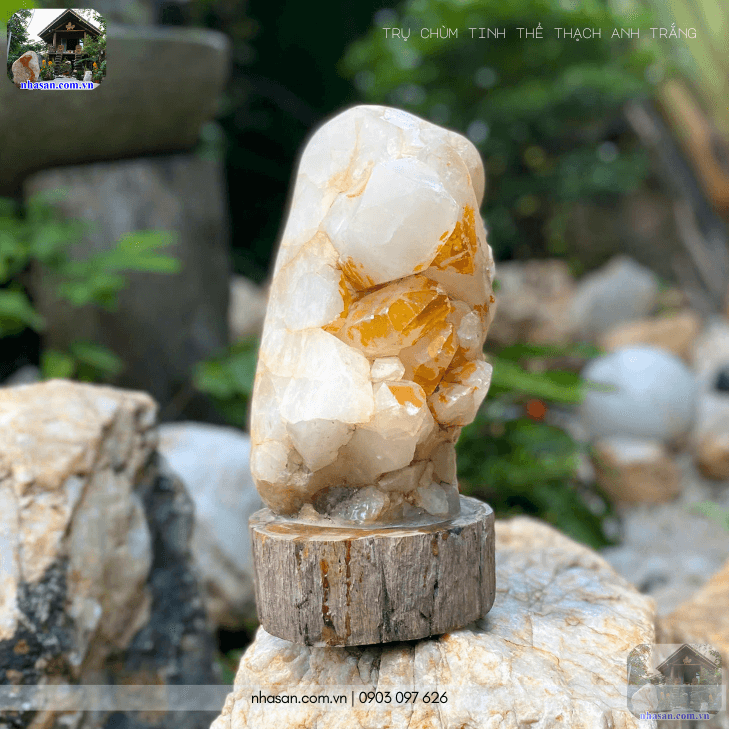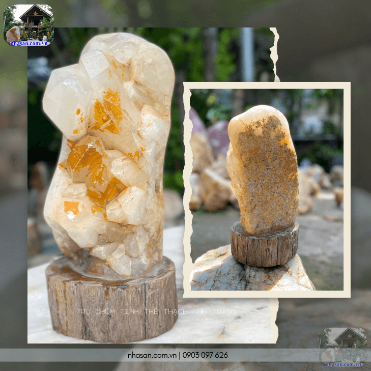 - Màu sắc: Màu trắng sữa, trong mờ đặc trưng của thạch anh trắng. Điểm nhấn là những mảng phèn màu vàng cam rực rỡ, độc đáo, tạo nên nét riêng cho sản phẩm.
