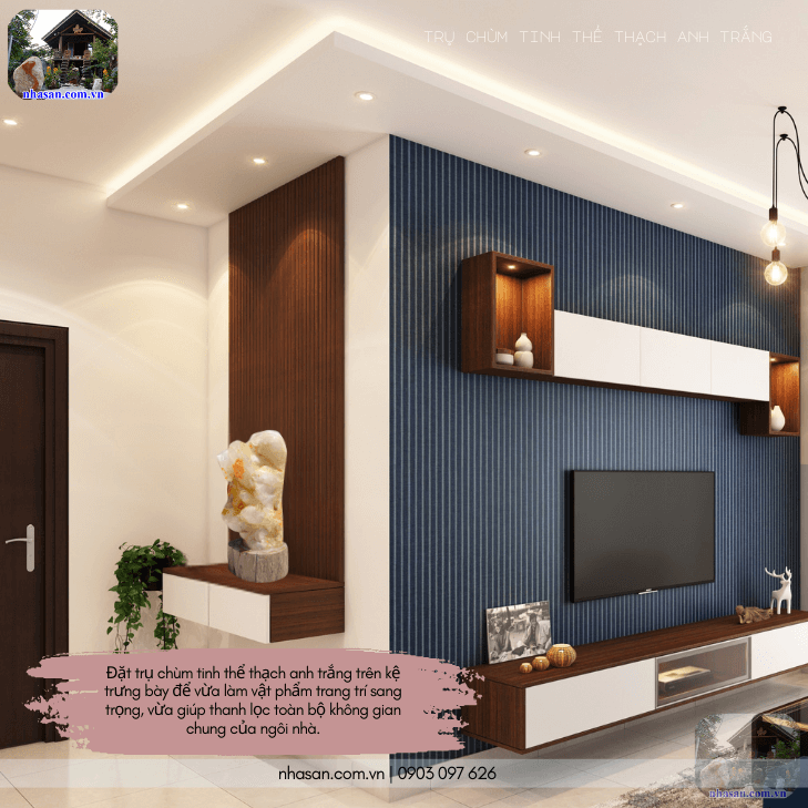 Đặt trụ chùm tinh thể thạch anh trắng trên kệ trang trí