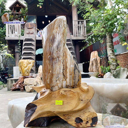 Đá canxedon phong thủy nâu đất thiên nhiên đế gỗ nặng 6kg