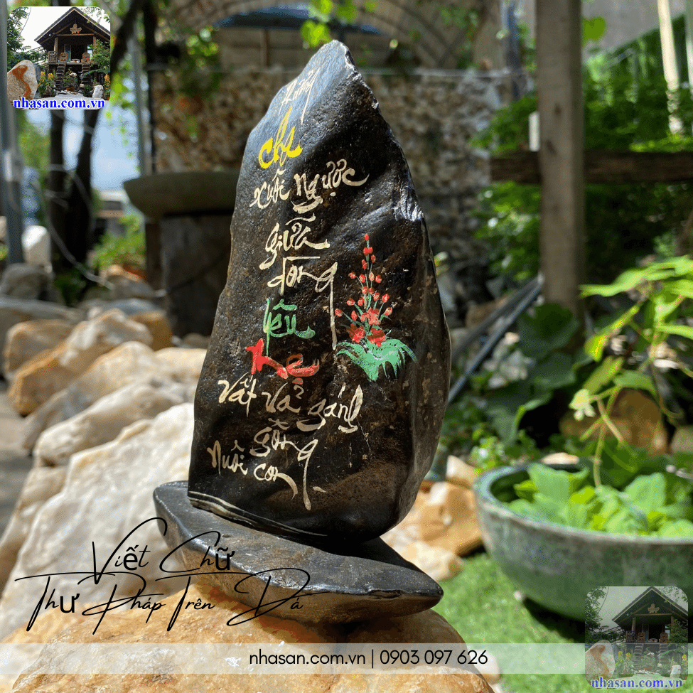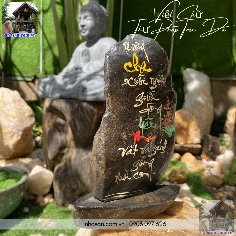 Viết chữ thư pháp trên đá "Thương cha xuôi ngược giữa dòng, yêu mẹ vất vả gánh gồng nuôi con".