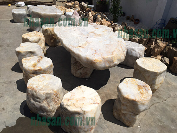 - Nếu bạn là người đam mê đá phong thủy, có sân vườn rộng xanh mát. Thì BÀN ĐÁ THẠCH ANH NGUYÊN KHỐI kèm theo 10 đôn bằng đá tự nhiên rất phù hợp để ăn nhậu uống trà đàm đạo.