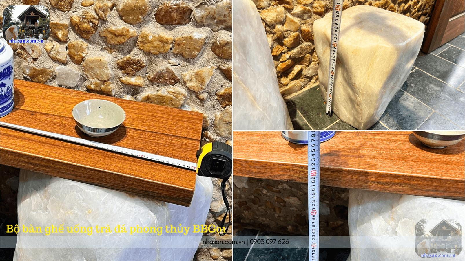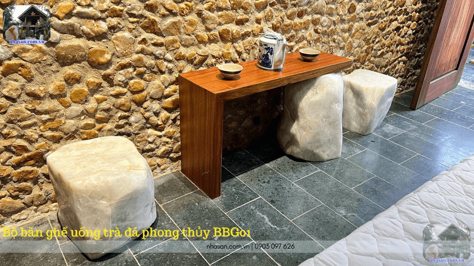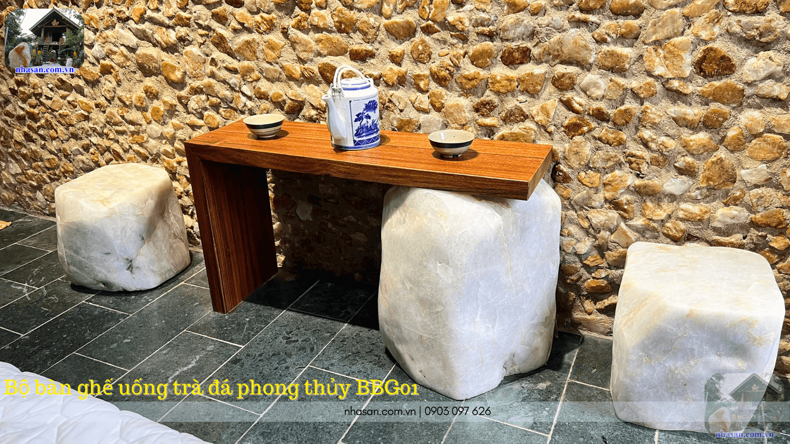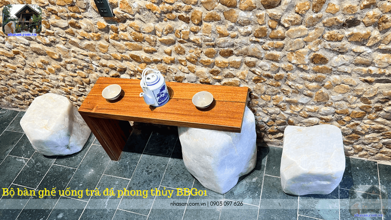 Bộ bàn ghế uống trà đá phong thủy là sự kết hợp hài hòa giữa vẻ đẹp tự nhiên của đá và sự ấm áp của gỗ. Đặc biệt, bộ bàn ghế được làm từ gỗ lim Nam Phi có chân một bên là đá thạch anh kết hợp đôn đá thạch anh trắng tự nhiên tạo nên sự độc đáo và ấn tượng vô cùng mạnh mẽ. Không những thế, bộ sản phẩm này còn mang ý nghĩa phong thủy vô cùng lớn.