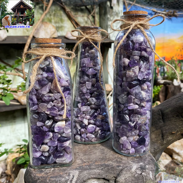 Đá thạch anh vụn tím đựng trong chai, lọ để trang trí