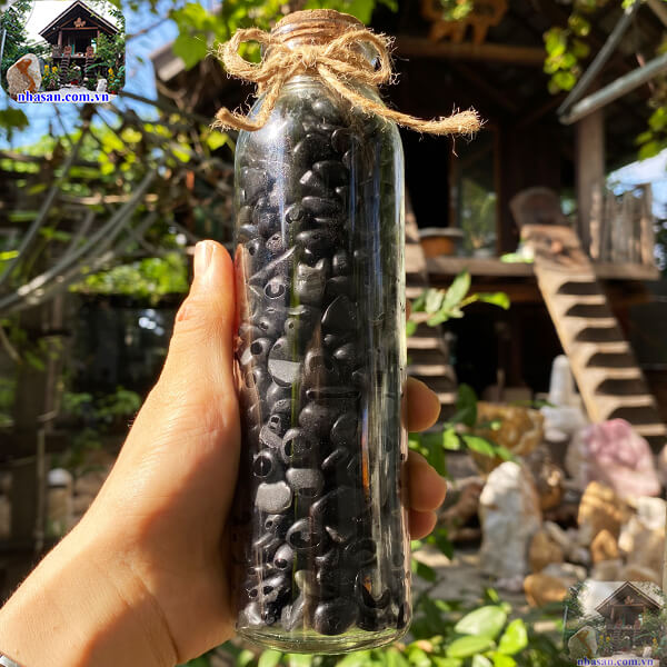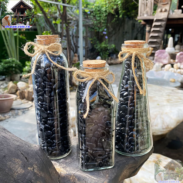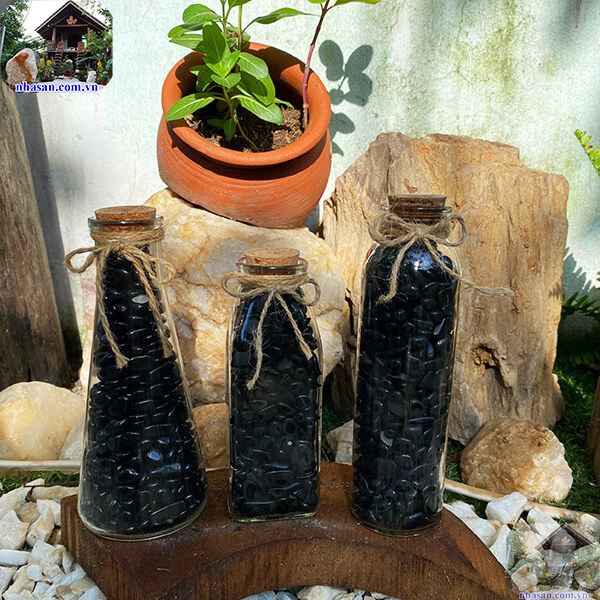 Lọ thủy tinh đựng đá phong thủy - Vụn bồ kết đen mài bóng có thể được sử dụng kết hợp với những loại đá phong thủy khác như: thạch anh trắng, vàng mắt hổ, thạch anh hồng, xanh mã não (thành ngũ hành tương sinh) vừa tạo điểm nhấn vừa có tác dụng phong thủy rất lớn,... Ngoài ra, sản phẩm cũng được sử dụng để trang trí nội thất, mang đến một vẻ đẹp sang trọng và tinh tế cho ngôi nhà.