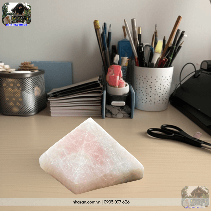 Đặt kim tự tháp thạch anh hồng trên bàn làm việc, bàn học