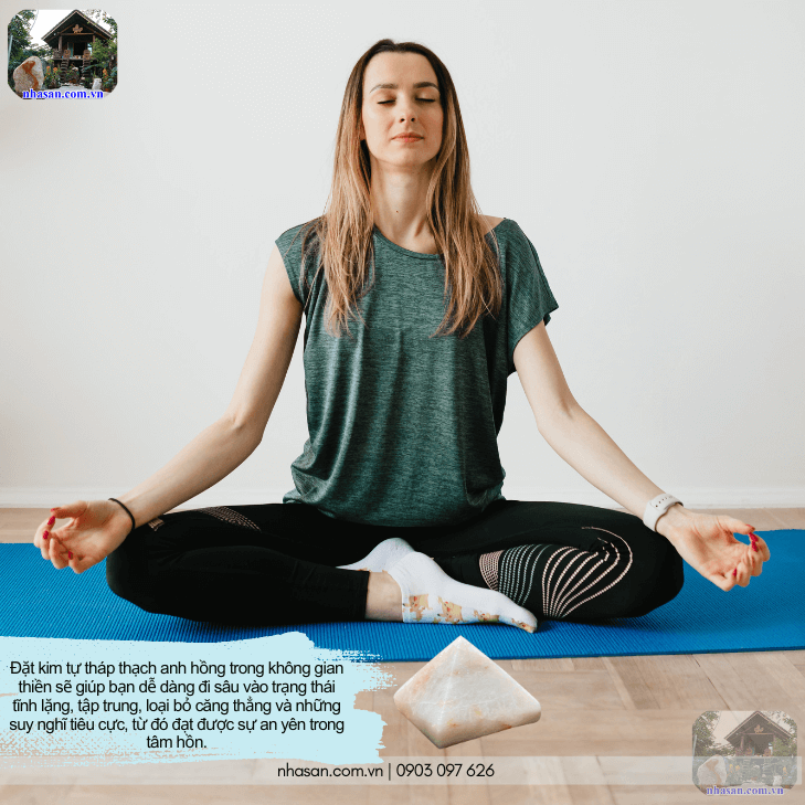Đặt kim tự tháp thạch anh hồng trong không gian thiền sẽ giúp bạn dễ dàng đi sâu vào trạng thái tĩnh lặng, tập trung, loại bỏ căng thẳng và những suy nghĩ tiêu cực, từ đó đạt được sự an yên trong tâm hồn.