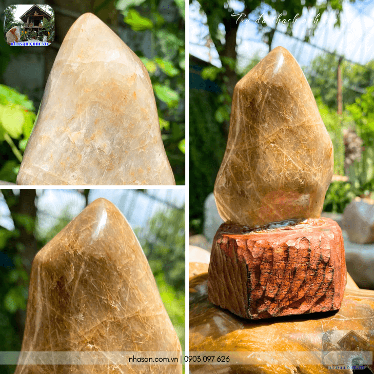 - Chất liệu: 100% đá thạch anh tóc nâu tự nhiên nguyên khối. Nhà Sàn cam kết không pha trộn, không qua xử lý hóa học để đảm bảo nguồn năng lượng thuần khiết nhất.