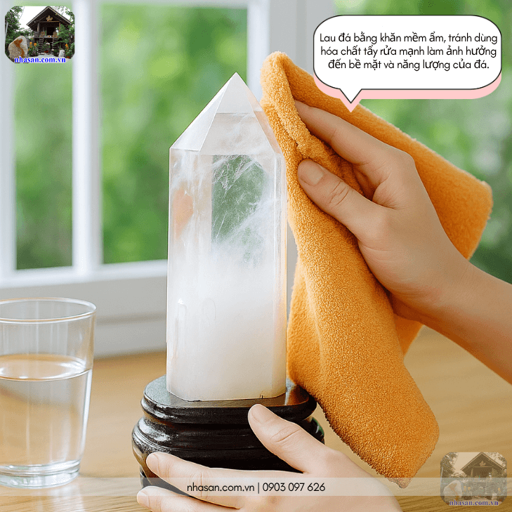Vệ sinh trụ tinh thể thạch anh trắng bằng khăn mềm ẩm