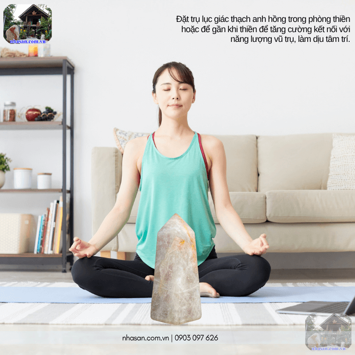 Đặt trụ lục giác thạch anh hồng trong phòng thiền hoặc để gần khi thiền để tăng cường kết nối với năng lượng vũ trụ, làm dịu tâm trí.