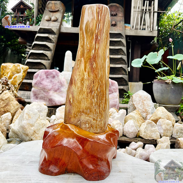 Trụ đá gỗ hóa thạch tự nhiên đánh bóng có kích thước cao 40cm, hình dạng giống như một cái cây bị chặt, trụ có màu vàng nhạt pha lẫn chút nâu cực đẹp.
