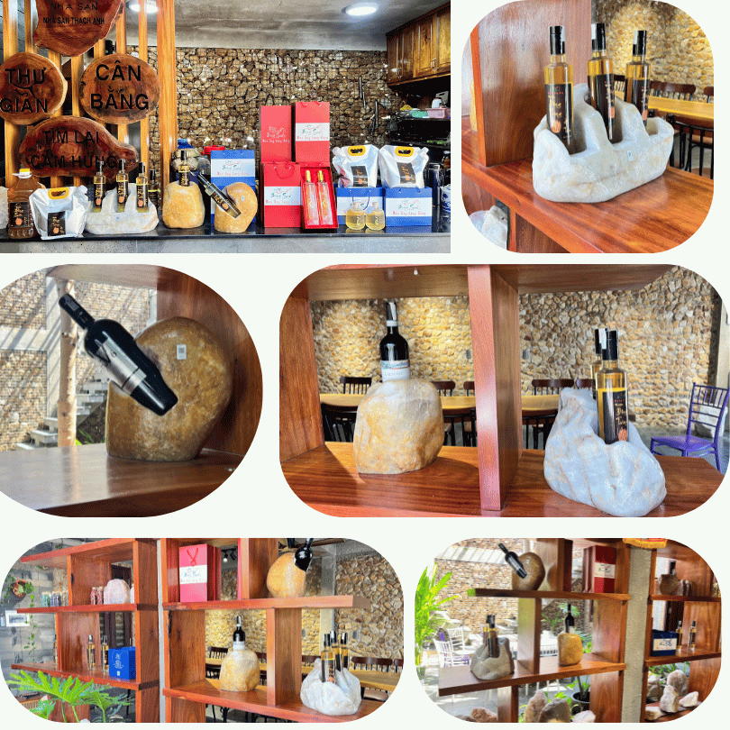 Bàn ghế và đôn ngồi bằng đá thạch anh năng lượng: Những khối đá thô sơ qua bàn tay anh em Nhà Sàn đánh bóng bề mặt, giữ nguyên nét xù xì tự nhiên xung quanh, trở thành những bộ bàn ghế độc đáo.