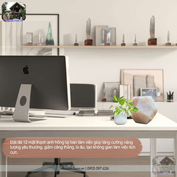 Đặt viên đá 12 mặt thạch anh hồng trên bàn làm việc