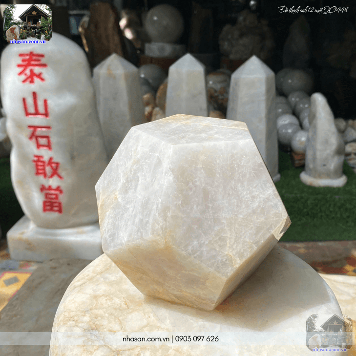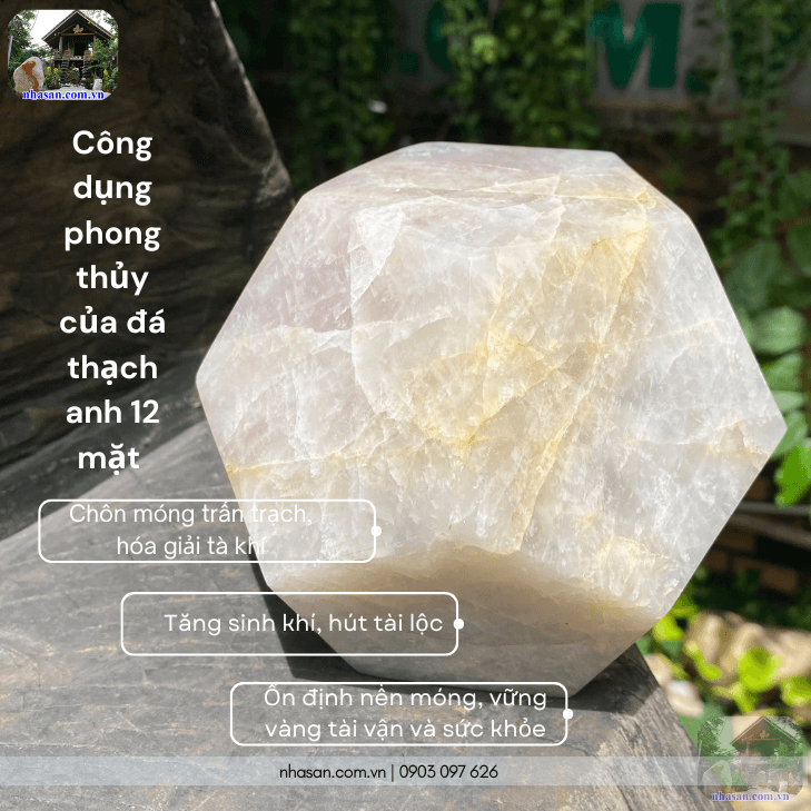 Khối đá thạch anh 12 mặt phát ra năng lượng mạnh mẽ, giúp ổn định long mạch, trấn giữ phong thủy cho toàn bộ ngôi nhà. Nó có khả năng hấp thụ và chuyển hóa những luồng khí tiêu cực, ngăn chặn sự xâm nhập của tà khí, mang lại bình an cho gia đạo.