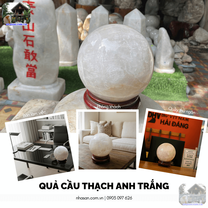 Thạch anh trắng được xem là biểu tượng của sự may mắn và thịnh vượng. Đặt quả cầu ở những vị trí quan trọng như bàn làm việc, phòng khách hay quầy thu ngân sẽ giúp kích hoạt tài lộc, thu hút vượng khí, mang lại cơ hội kinh doanh và tiền tài dồi dào.