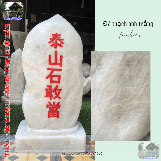 - Đá Thạch Anh: Đây là vật liệu đỉnh cao nhất để làm bia trấn trạch. Thạch anh (đặc biệt là thạch anh trắng, thạch anh khói) có chỉ số năng lượng Bovis rất cao. Nó không chỉ cản phá sát khí mà còn có khả năng tự động chuyển hóa năng lượng xấu thành năng lượng tốt, tạo ra một lớp màng bảo vệ vô hình vô cùng sinh động.