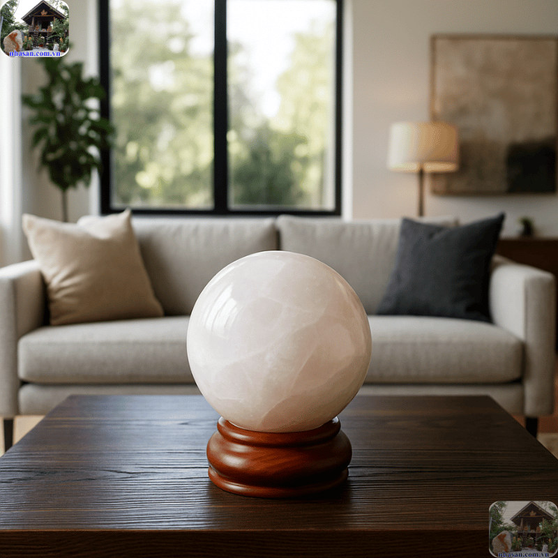 - Vị trí: Đặt quả cầu (thạch anh trắng, vàng, hồng) trên bàn làm việc, đặc biệt là ở góc Đông Nam (cung tài lộc) hoặc góc Đông Bắc (cung tri thức).