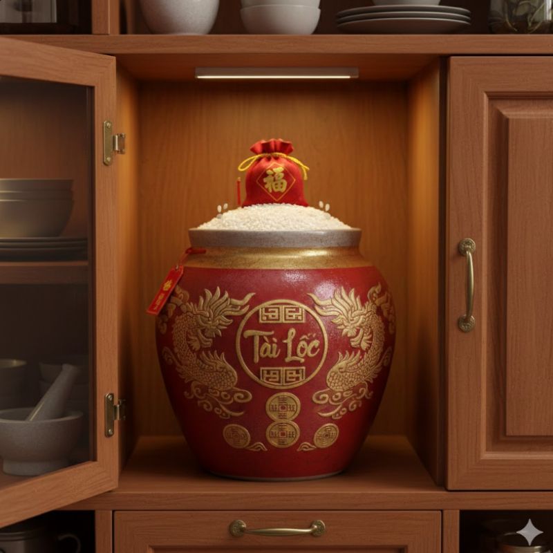 - Vật phẩm đi kèm: Để tăng cường sức mạnh, bạn có thể đặt một phong bao lì xì đỏ dưới đáy hũ gạo hoặc thả vào 3 đồng tiền xu cổ.