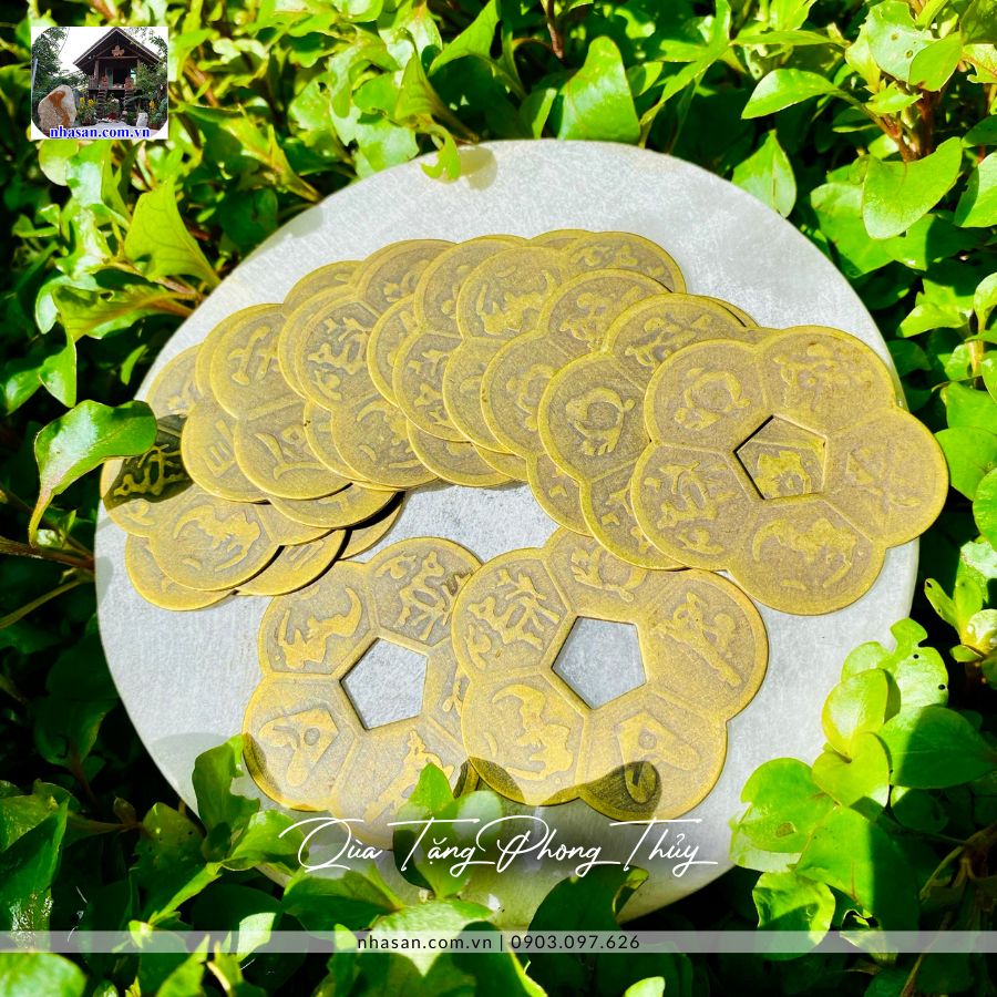Đồng xu phong thủy có hình tròn, tượng trưng cho sự hoàn hảo, viên mãn. Hai mặt đồng xu có khắc hình tròn ở giữa, tượng trưng cho trời và đất. Bên ngoài có khắc các chữ "Vạn" và "Thọ", tượng trưng cho sự trường thọ, vạn sự như ý.