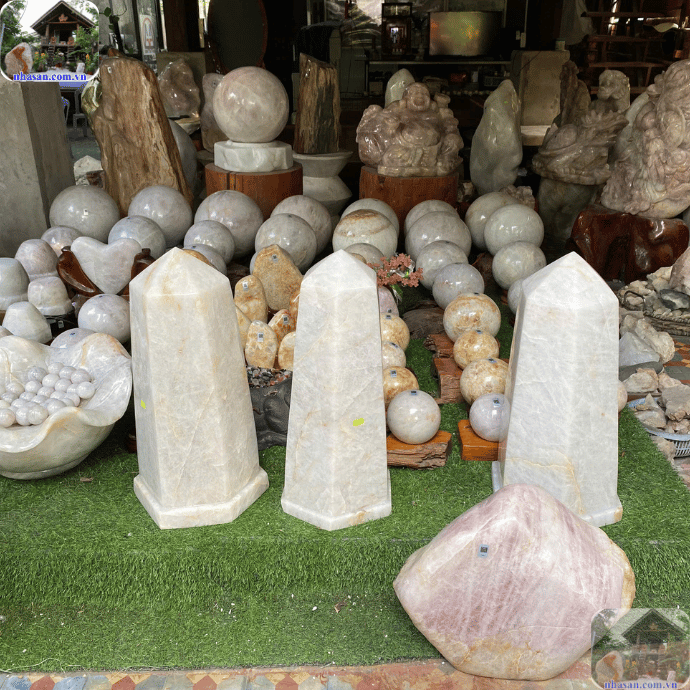 Tại các khu vực như Dĩ An – Bình Dương, Thủ Đức – TP.HCM hay các cửa hàng đá phong thủy tại Hà Nội, đá thạch anh được bán rộng rãi, từ vòng tay, dây chuyền đến bi cầu, trụ đá và tượng điêu khắc.