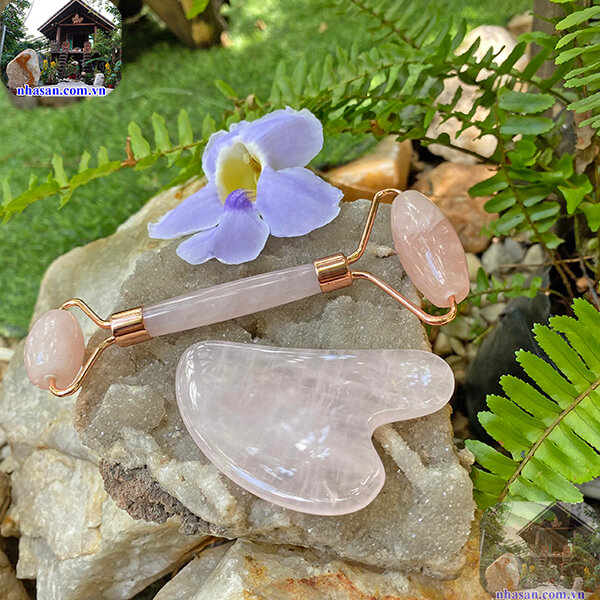 - Bộ dụng cụ massage mặt đá thạch anh hồng là bộ sản phẩm gồm cây lăn mặt và miếng đá massage nâng cơ mặt. Mỗi một dụng cụ đều có công dụng riêng như sau: