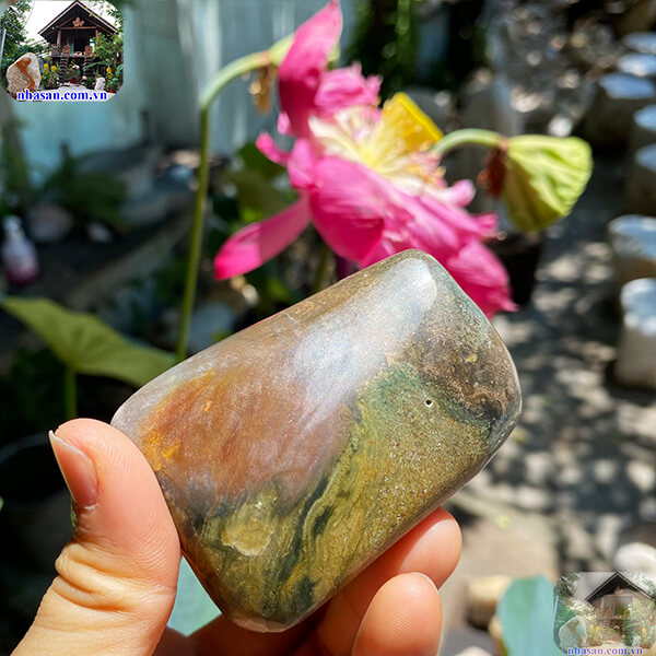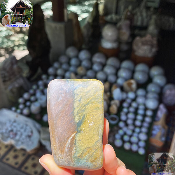 Đá chặn giấy canxedon tự nhiên mang hai sắc thái xanh rêu kết hợp cùng nâu đất. Màu xanh rêu biểu trưng cho sự bền vững, ổn định và cân bằng. Màu nâu đất mang ý nghĩa tài lộc và may mắn. Sự kết hợp hoàn hảo của hai màu tạo nên cục đá chặn giấy tinh tế có một không hai là món quà từ mẹ thiên nhiên ban tặng.