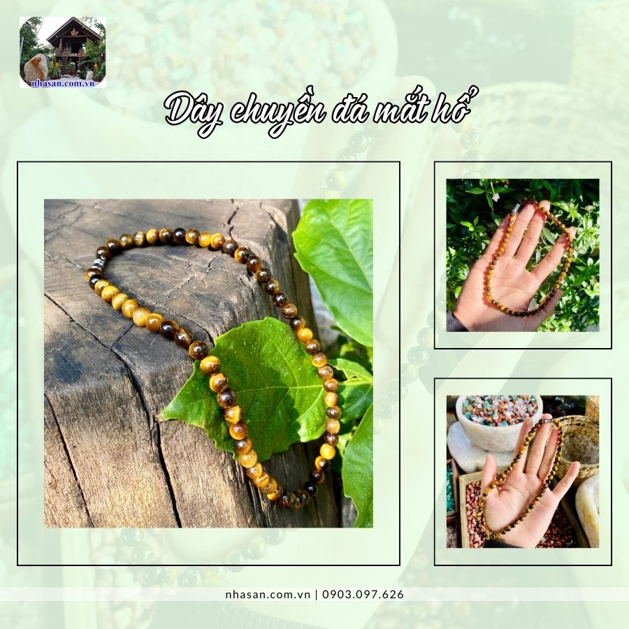 Dây chuyền đá mắt hổ thuộc hành thổ nên rất phù hợp cho người mệnh thổ và kim. Đá mắt hổ là một loại đá biến thể của họ thạch anh, có hiệu ứng mắt mèo và ánh lụa. Đá mắt hổ có màu vàng, nâu hoặc nâu đỏ, khi có ánh sáng chiếu vào sẽ tạo ra dải màu vàng và nâu vàng, lấp lánh như mắt hổ. Riêng đối với đá mắt hổ tạo nên vòng cổ đá tự nhiên hợp hơn cho chân dung người đàn ông bản lĩnh và mạnh mẽ can trường. Người đàn ông có thể làm chủ cuộc chơi tạo ra trạng thái sức khỏe nhất, trí tuệ nhất và vạn sự trong kinh doanh sẽ hanh thông.
