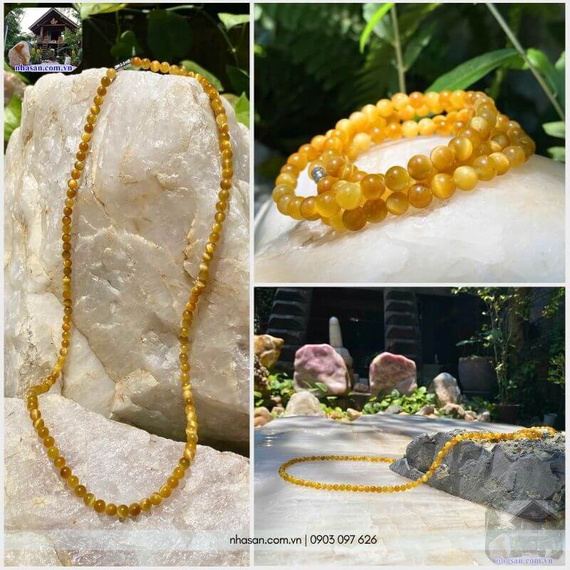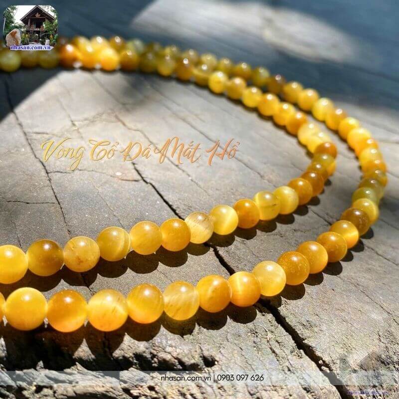 Ý nghĩa phong thủy của vòng cổ đá mắt hổ tâm vàng tươi 108 hạt