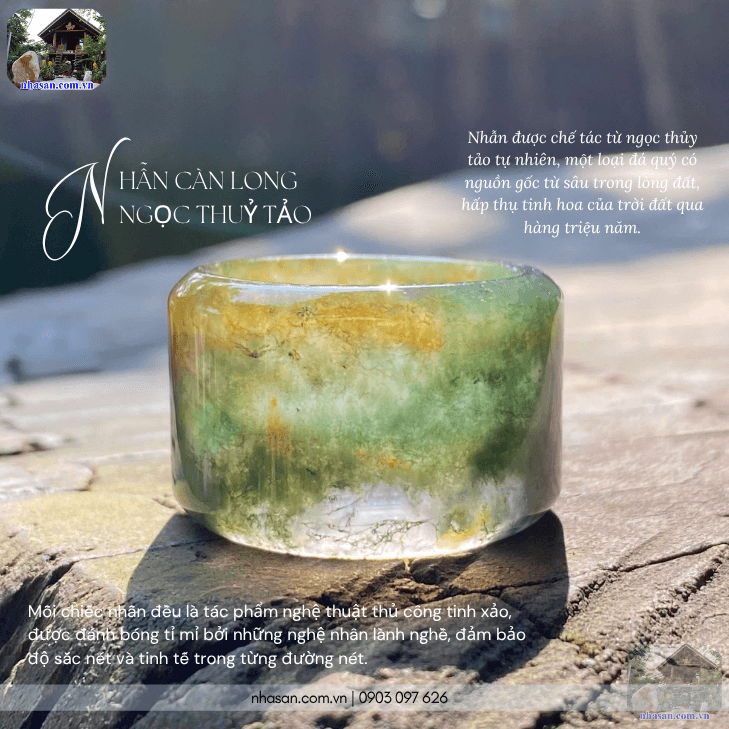 Nhẫn được chế tác từ ngọc thủy tảo tự nhiên, một loại đá quý có nguồn gốc từ sâu trong lòng đất, hấp thụ tinh hoa của trời đất qua hàng triệu năm. Ngọc thủy tảo nổi bật với những vân đá độc đáo, tạo nên những "bức tranh" tuyệt đẹp, ẩn chứa vẻ đẹp tinh túy của thiên nhiên. Mỗi chiếc nhẫn đều là tác phẩm nghệ thuật thủ công tinh xảo, được đánh bóng tỉ mỉ bởi những nghệ nhân lành nghề, đảm bảo độ sắc nét và tinh tế trong từng đường nét.