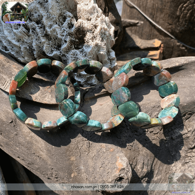 Vòng đá canxedon bản oval xanh lục kết hợp nâu đặc biệt phù hợp với những người thuộc mệnh Mộc và mệnh Hỏa. Màu xanh lá cây tương sinh với mệnh Mộc, giúp tăng cường năng lượng và sự phát triển. Mộc sinh hỏa, do đó màu xanh lá cây cũng mang lại những điều tốt lành cho người mệnh Hỏa.