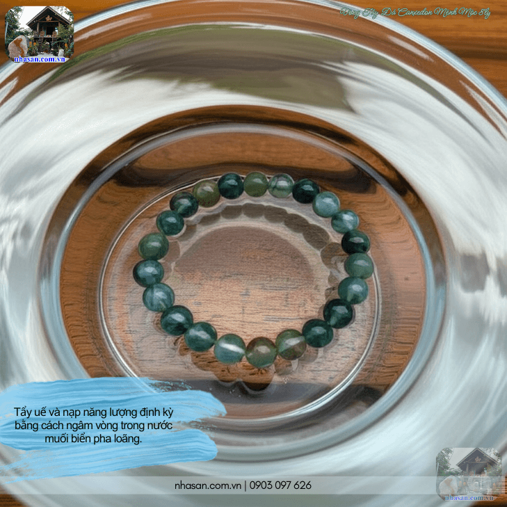 - Tẩy uế và nạp năng lượng định kỳ bằng cách đặt vòng dưới ánh trăng rằm, ngâm trong nước muối biển pha loãng hoặc dùng trầm hương để xông.