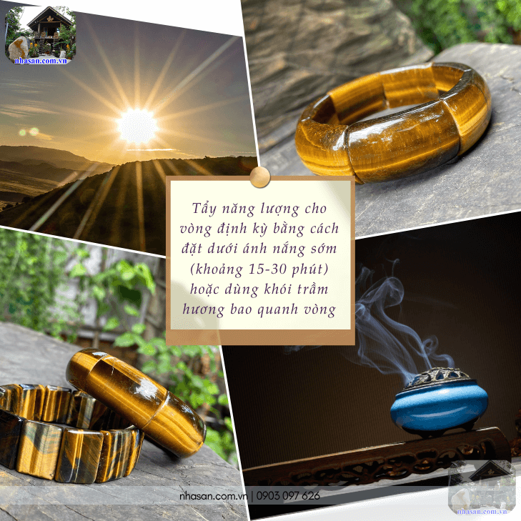- Tẩy năng lượng định kỳ: Để đá luôn giữ được năng lượng tích cực, bạn nên tẩy năng lượng cho vòng định kỳ bằng cách đặt dưới ánh nắng sớm (khoảng 15-30 phút) hoặc dùng khói trầm hương bao quanh vòng.