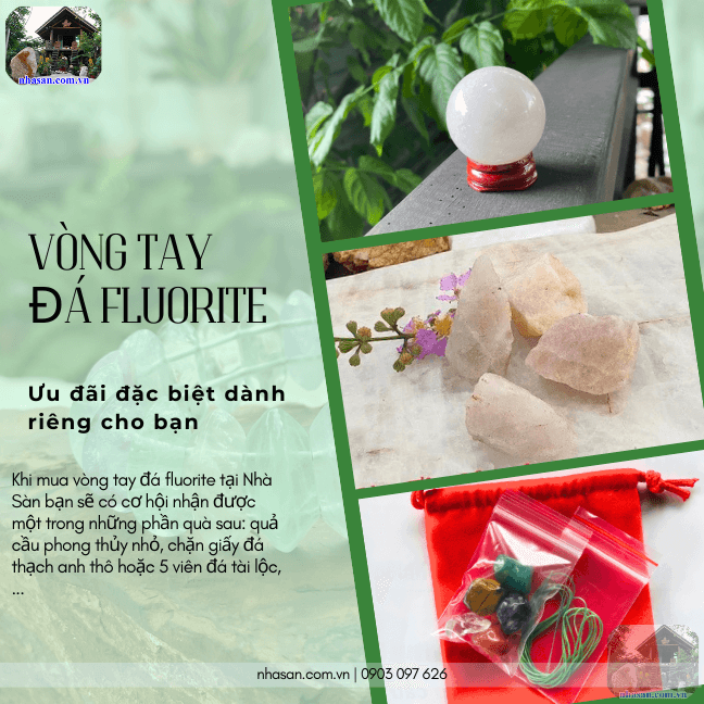 Khi mua vòng tay đá fluorite tại Nhà Sàn bạn sẽ có cơ hội nhận được một trong những phần quà sau: quả cầu phong thủy nhỏ, chặn giấy đá thạch anh thô hoặc 5 viên đá tài lộc, ...