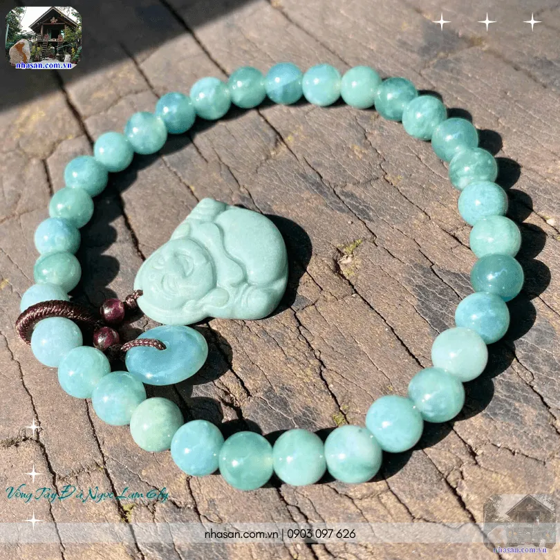 Vòng tay đá ngọc lam 6ly mix charm Phật Di Lặc & Đồng điếu